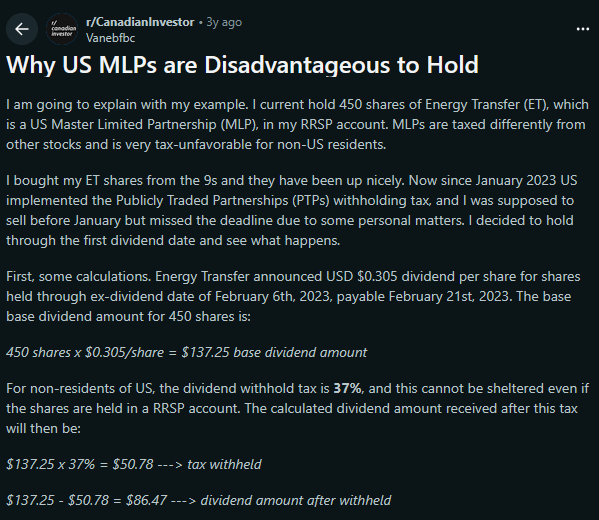 MLPs are treated very differently. They do not benefit from that treaty treatment. Distributions from MLPs are fully subject to U.S. withholding tax. Worse, the rate is not 15%. It is up to 37%. This withholding applies even inside registered accounts, including RRSPs.